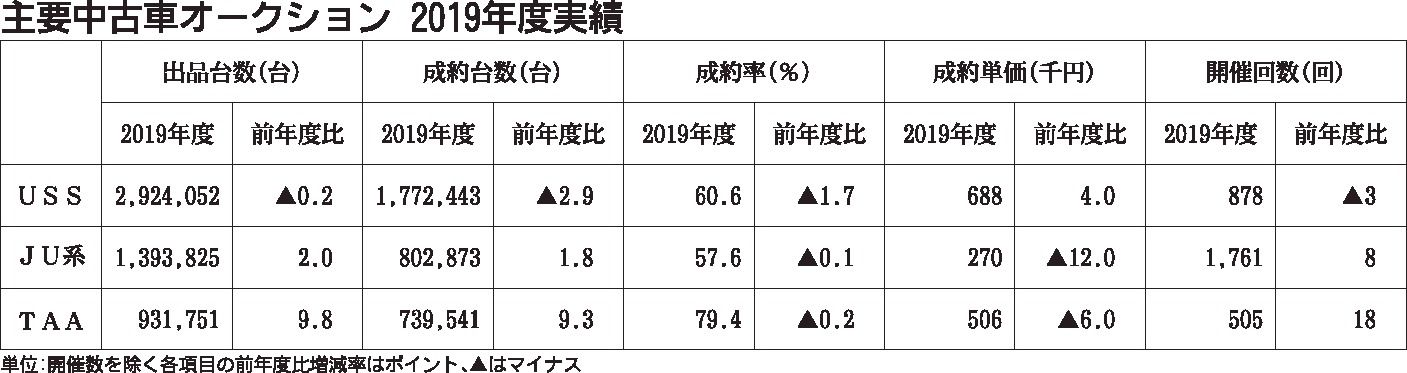 大手中古車オークション(AA)各社の2019年度実績が出そろった。出品台数では、トヨタユーゼック(北口武志社長、千葉市美浜区)が運営するトヨタオートオークション(TAA)が、4年連続で過去最高を更新。日本中古自動車販売商工組合連合会(JU...