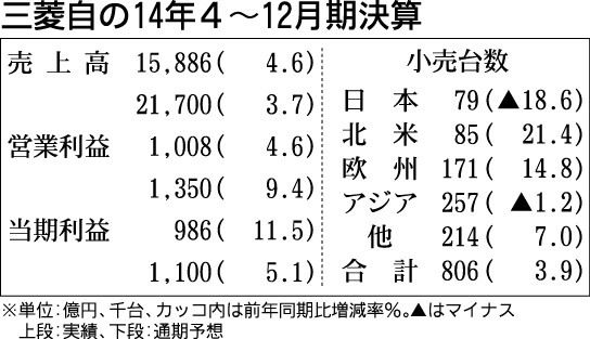 三菱自動車は3日、2015年3月期売上高見通しを前回公表(14年10月29日)値から100億円減の2兆1700億円に修正すると発表した。国内やタイ市場回復の遅れなどを反映し、小売台数の見通しを2万2千台減の106万7千台(前期比2万台増)...