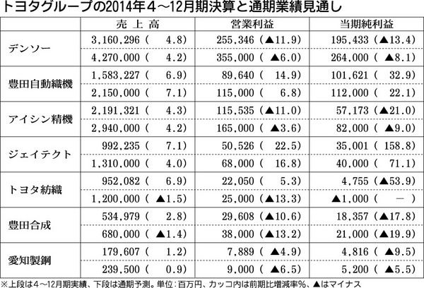 トヨタ系大手部品メーカー14年4~12月期業績、円安効果で全社増収