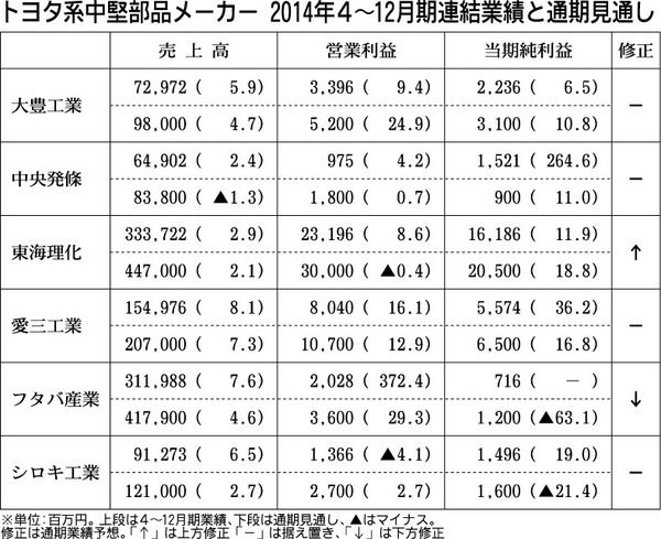 トヨタ系中堅部品メーカーが2日発表した2014年4~12月期連結決算は、シロキ工業を除く5社が増収増益となった。消費増税による反動減が長期化して国内事業が減少基調となったものの、北米市場の好調や円安による為替差益で業績を伸ばした。東海理化...