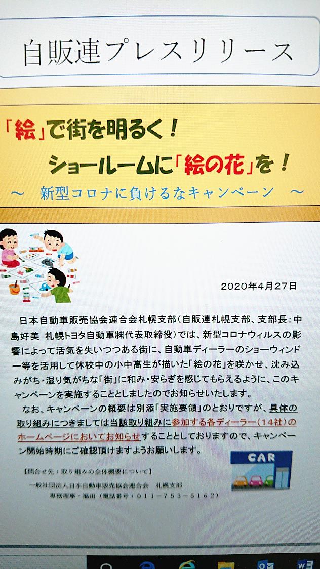 【札幌】自販連札幌支部(中島好美支部長)は27日、「『新型コロナウイルスに負けるな』キャンペーン」を展開する、と発表した。新型コロナウイルス感染拡大の影響で休校を余儀なくされている小中高生を対象に「絵」の作品を公募し、集まった作品を会員デ...