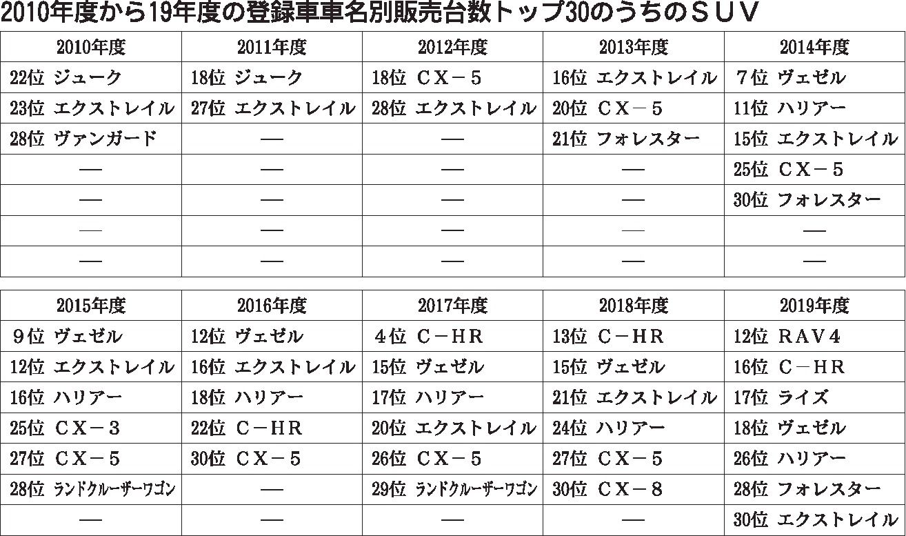 新車販売でSUVの伸長が鮮明に─。2019年度の車名別販売台数ランキングで、ベスト30のうちSUVが7車種を占めた。トヨタ自動車の「RAV4」や「ライズ」など昨年投入の新型車が発売当初から販売台数を伸長し、上位に食い込んだ。トヨタ「ハリア...