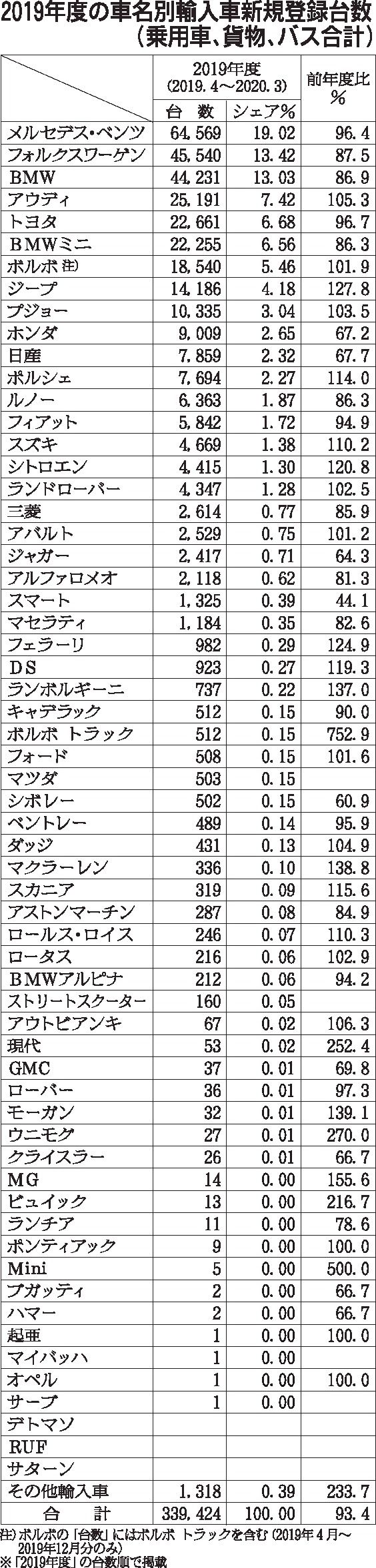 〈2019年度の車名別輸入車新規登録台数(乗用車、貨物、バス合計)〉