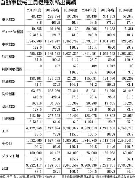 日本自動車機械器具工業会(自機工、山口伸一郎理事長)がまとめた2016年度の自動車機械工具輸出実績は前年比2・6%減の53億2172万円だった。先に発表した日本自動車機械工具協会(機工協、柳田昌宏会長)の実績と合わせると同5・4%減の87...