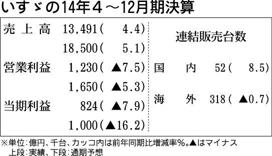 いすゞ自動車が6日発表した2014年4~12月期連結決算は、タイでの新車販売低迷に加え、今後の事業拡大に向けた成長戦略関連費用を計上したため、全ての利益段階で減益となった。川原誠取締役常務執行役員は、将来に向けた投資を先行したことによる減...