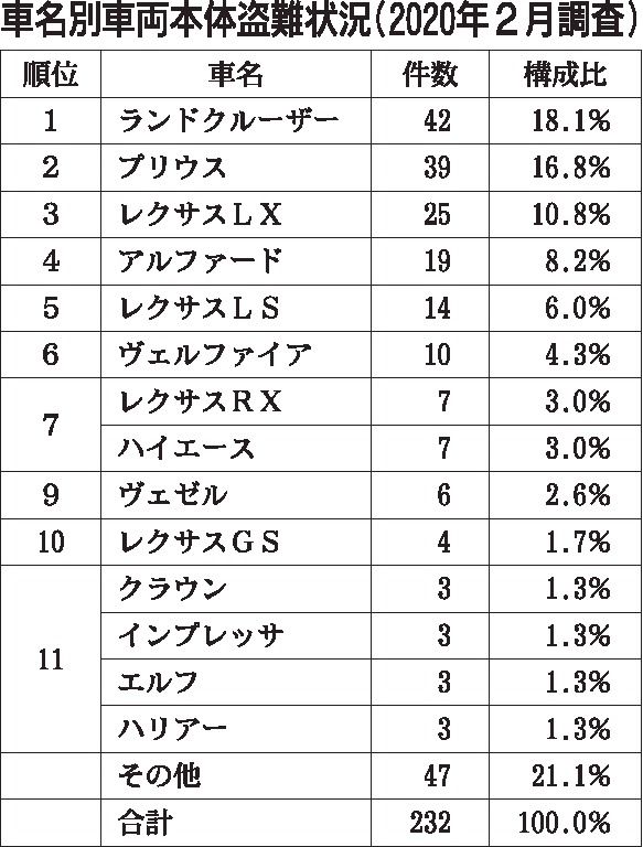 車両盗難、1位ランクル 2位プリウス トヨタ上位独占 レクサスなど高額車に狙い 日本損害保険協会調査