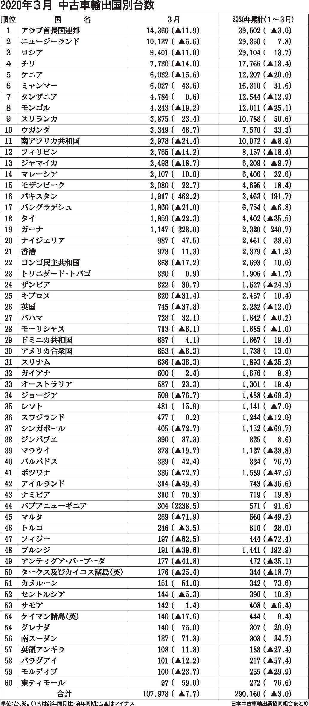 日本中古車輸出業協同組合(佐藤博理事長)がまとめた2020年3月の中古車輸出台数は、前年同月比7・7%減の10万7978台で、4カ月ぶりに減少した。アラブ首長国連邦(UAE)やロシア、チリなど輸出台数が多い仕向け国で2桁以上のマイナスとな...