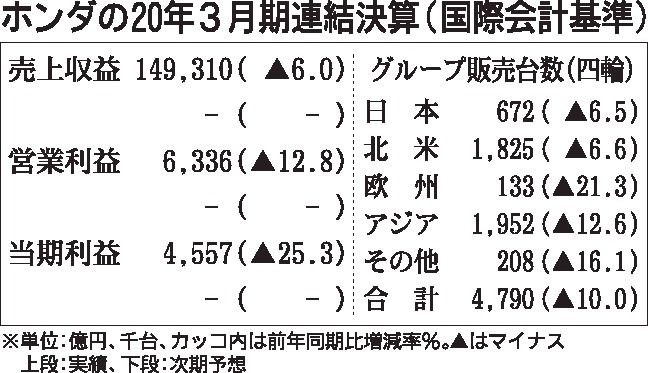 ホンダが12日に発表した2020年3月期連結業績は、四輪事業の減少や為替換算による減少、新型コロナウイルスの感染拡大などにより減収減益となった。売上高は3期ぶり、営業利益は3期連続、当期純利益は2期連続のマイナス。グループの販売台数は、四...