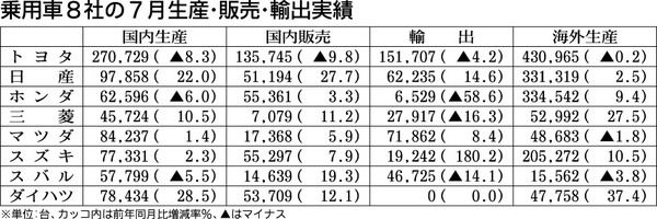 乗用車メーカー8社が30日まとめた7月の生産・輸出実績は、8社合計の国内生産台数が前年同月比1・4%増の77万4708台だった。輸出は微減だったが、好調な国内販売を反映し、5社が前年同月を上回った。海外生産は同5・6%増の146万7093...