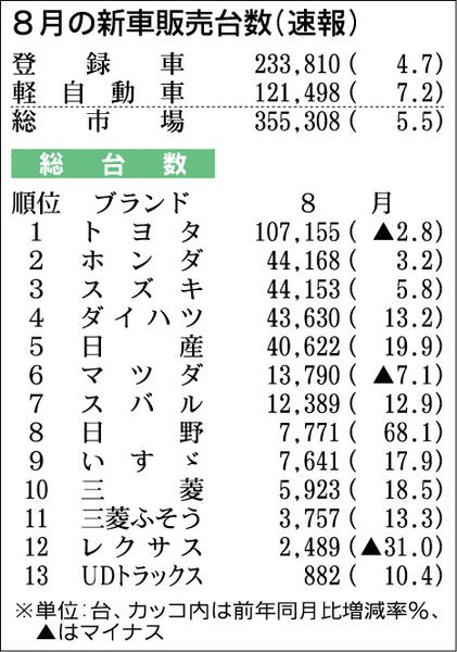 8月の新車販売(登録車、軽自動車合計)は、前年同月比5・5%増の35万5308台で10カ月連続のプラスとなった。登録車は同4・7%増の23万3810台で2カ月ぶりに増加した。23万台を超えたのは約5年ぶり。日本自動車販売協会連合会(自販連...