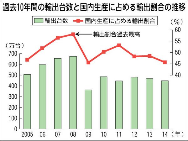 国内生産に占める輸出割合の低下が目立っている。日本自動車工業会(池史彦会長)によると2014年の輸出割合は45・7%となり、前年から2・8ポイントも落とした。自動車メーカー各社は世界的な新車供給の効率向上に加え、為替リスクの低減を狙いに海...