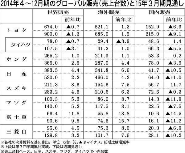2014年4~12月期の世界販売は、トヨタ自動車グループを除いた全社が前年実績を上回った。各社は消費増税に伴う駆け込み需要の反動減からの回復が遅れている国内販売が減少したが、好調な海外販売がグローバル実績を支えた格好だ。しかし、その海外販...