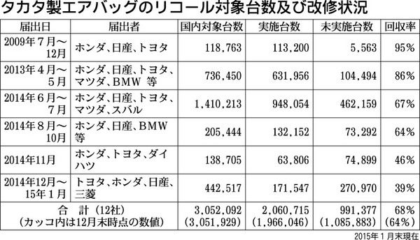国土交通省は、タカタ製エアバッグのリコール(回収・無償修理)進ちょく状況を公表した。1月末時点の改修率は68%で、前月に比べ4ポイント上がり、未実施台数は99万1377台と100万台を切った。対象台数は12社合わせて305万2092台。...