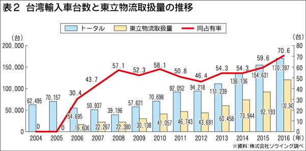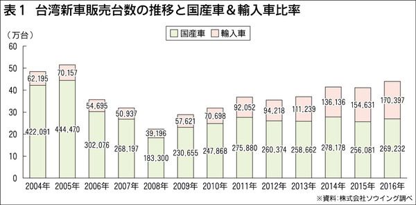 台湾における2016年通年での新車販売台数(ナンバープレート交付ベース)は43万9、629台(前年比4・5%増)で、11年来の最多を更新した。メーカー別ではトヨタが13万9495台(前年比5・3%増)で、15年連続の首位。2位が三菱で4万...