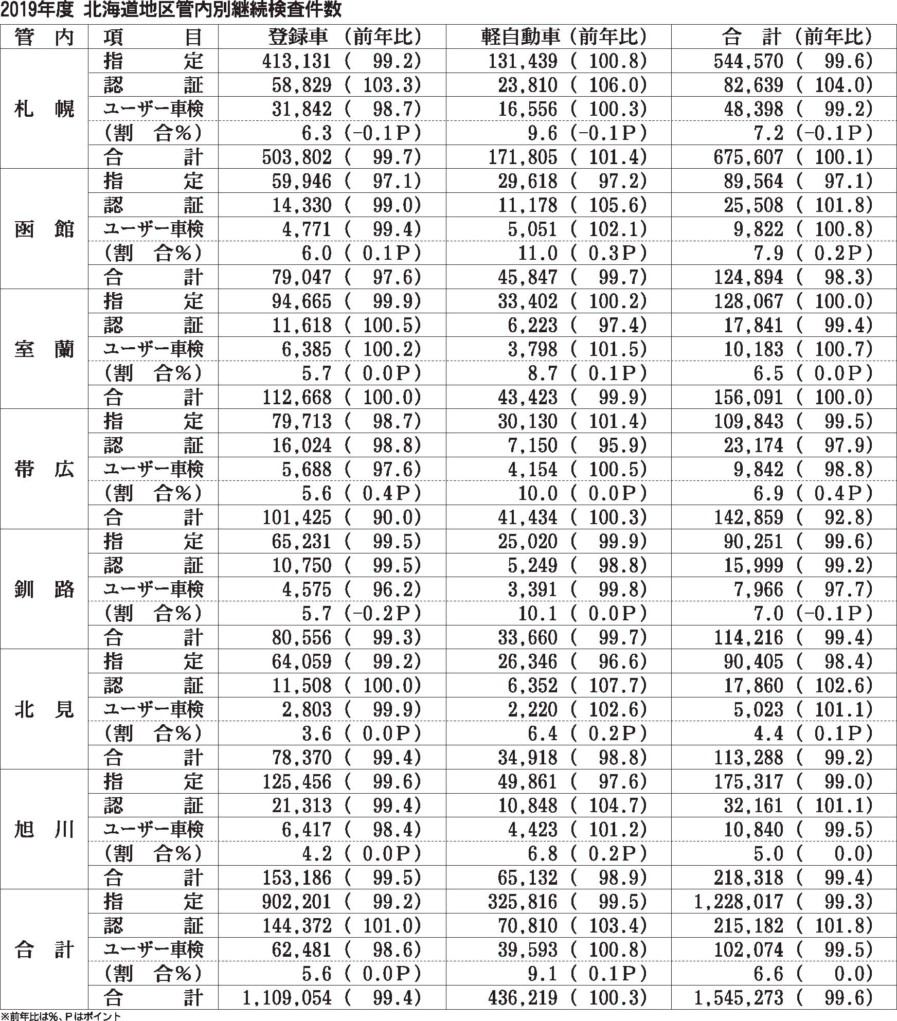 2019年度の北海道地区総継続検査実績(含む軽自動車、速報値)は、前年度比0・4%減の約154万5千件だった。うち登録車が0・6%減で、軽自動車は0・3%増の微増となった。ユーザー車検は全体の6・6%を占める10万2千件余りあった。(一部...