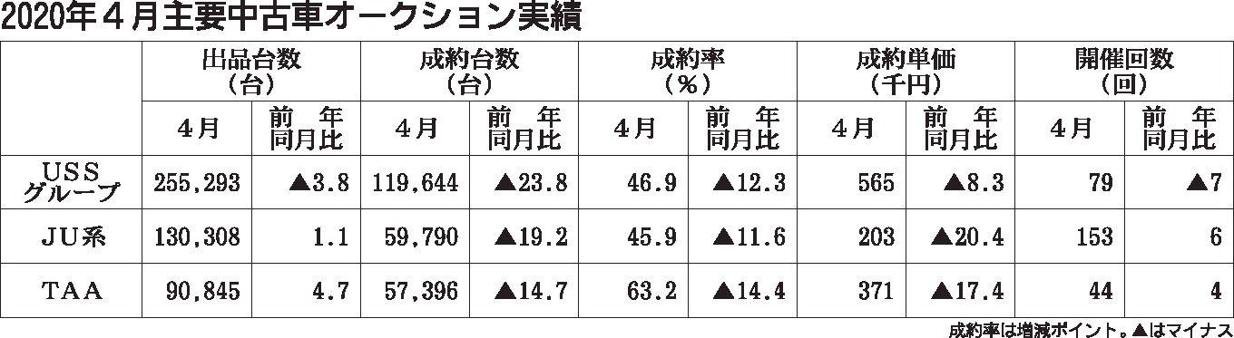 ユー・エス・エス(USS)が発表した2020年4月の中古車オークション(AA)実績は、出品台数が前年同月比3・8%減の25万5293台と6カ月連続で前年を下回った。成約台数は同23・8%減の11万9644台、成約率は同12・3㌽減の46・...