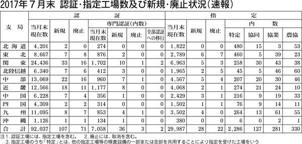 国土交通省は2017年7月末時点の認証・指定工場数および新規・廃止状況をまとめた。認証工場は前月比36件増の9万2037工場となった。指定工場数は4件増の2万9987工場と2カ月ぶりに増加。専門認証工場数は31件増の7058工場だった。 ...