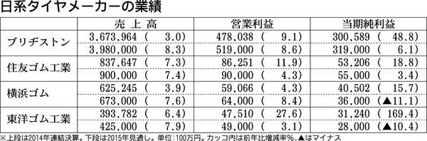 日系タイヤメーカー4社の2014年12月期の決算が出揃った。原材料価格が低水準で推移していることに加えて為替差益が貢献し、4社ともに売上高、利益ともに過去最高を更新した。その一方で販売競争の激化などによるタイヤ価格の下落が激しく、業績に大...