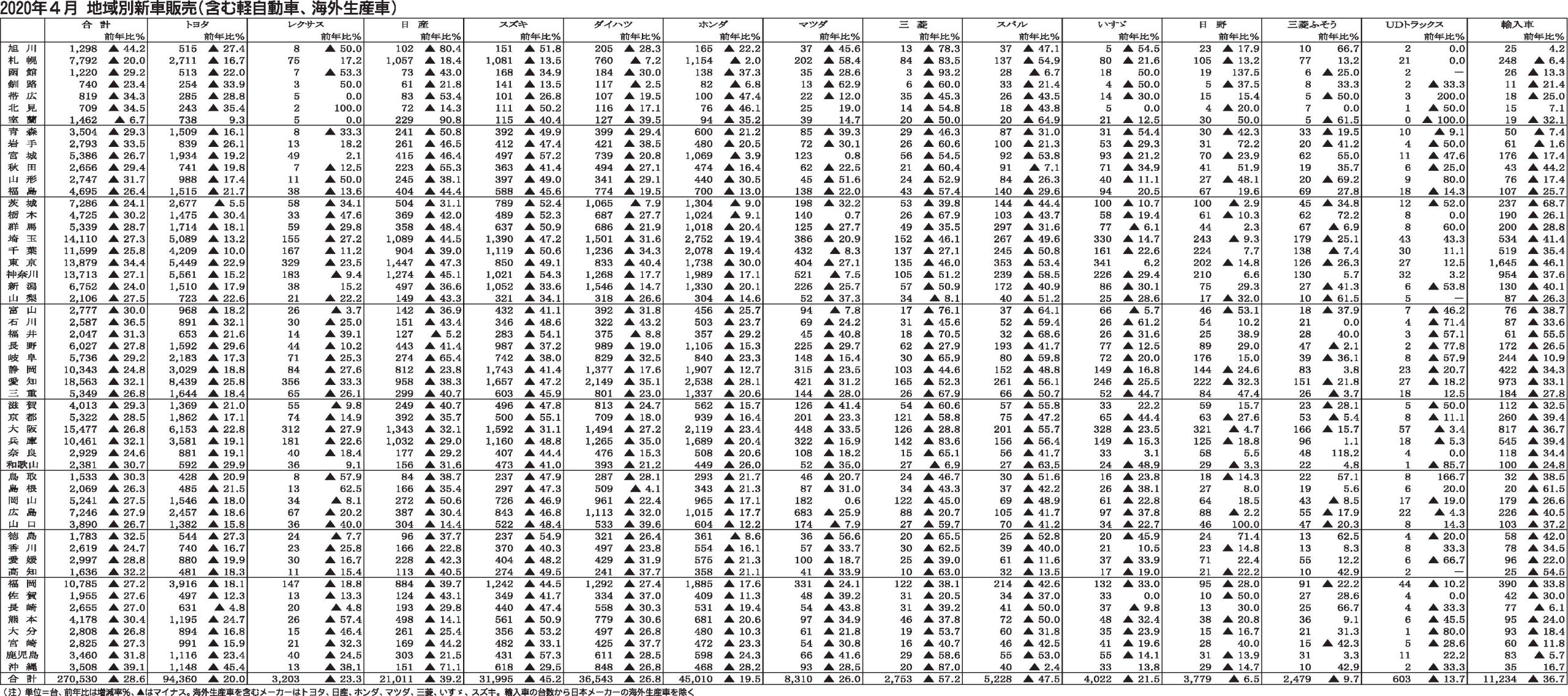 〈2020年4月 地域別新車販売(含む軽自動車、海外生産車)〉