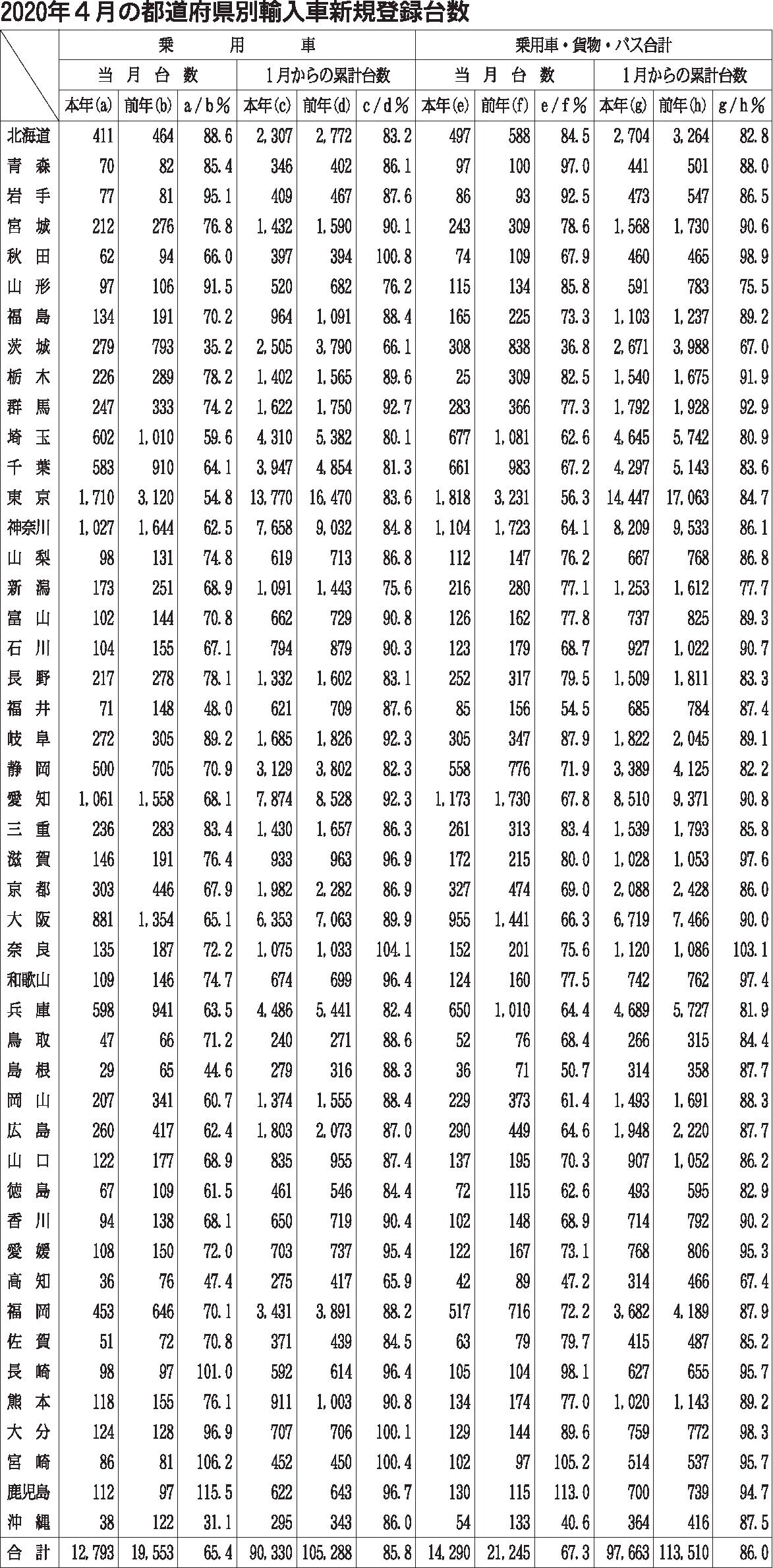 〈2020年4月の都道府県別輸入車新規登録台数〉