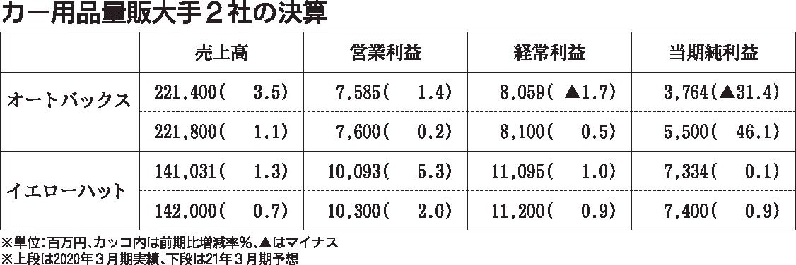 カー用品量販大手のオートバックスセブンとイエローハットの2020年3月期決算が出揃った。上期は消費税増税前の駆け込み需要とタイヤの値上げ前特需で好調だったが、下期は消費税増税に伴う反動減や暖冬の影響によるスタッドレスタイヤの販売伸び悩みで...