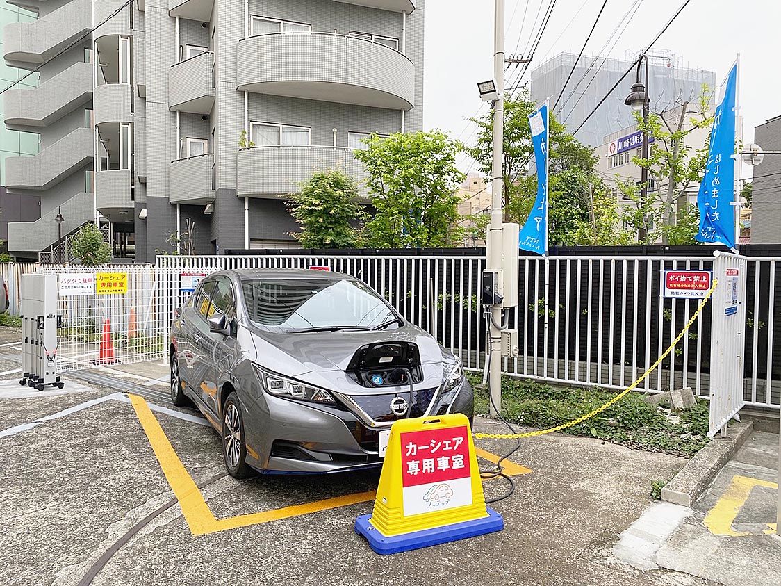 車両を貸し出す最初のステーションは、神奈川県川崎市のNTT川崎北ビルの駐車場に開設した。まずは日産自動車の電気自動車(EV)「リーフ」1台を配置。今後は、社有車と各地にあるNTT東日本のビルの敷地を活用してステーションを増やしていく計画だ。