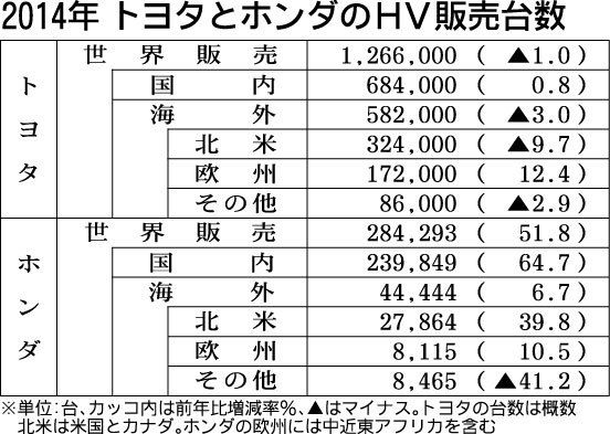トヨタ自動車とホンダの2014年のハイブリッド車(HV)世界販売状況がまとまった。トヨタは前年比1・0%減の126万6千台だったのに対し、ホンダは同約1・5倍の28万4千台と大幅に伸びた。両社にとって最大市場である国内での販売はともに増加...