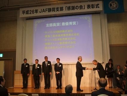 【静岡】日本自動車連盟(JAF)静岡支部(杉山智彦支部長)は13日、静岡市内のホテルで「平成26年JAF静岡支部感謝の会」を開催した。 昨年に続き2回目の静岡支部単独開催で、昨年1~12月にJAF会員の増加に功績があった静岡県内の自動車販...