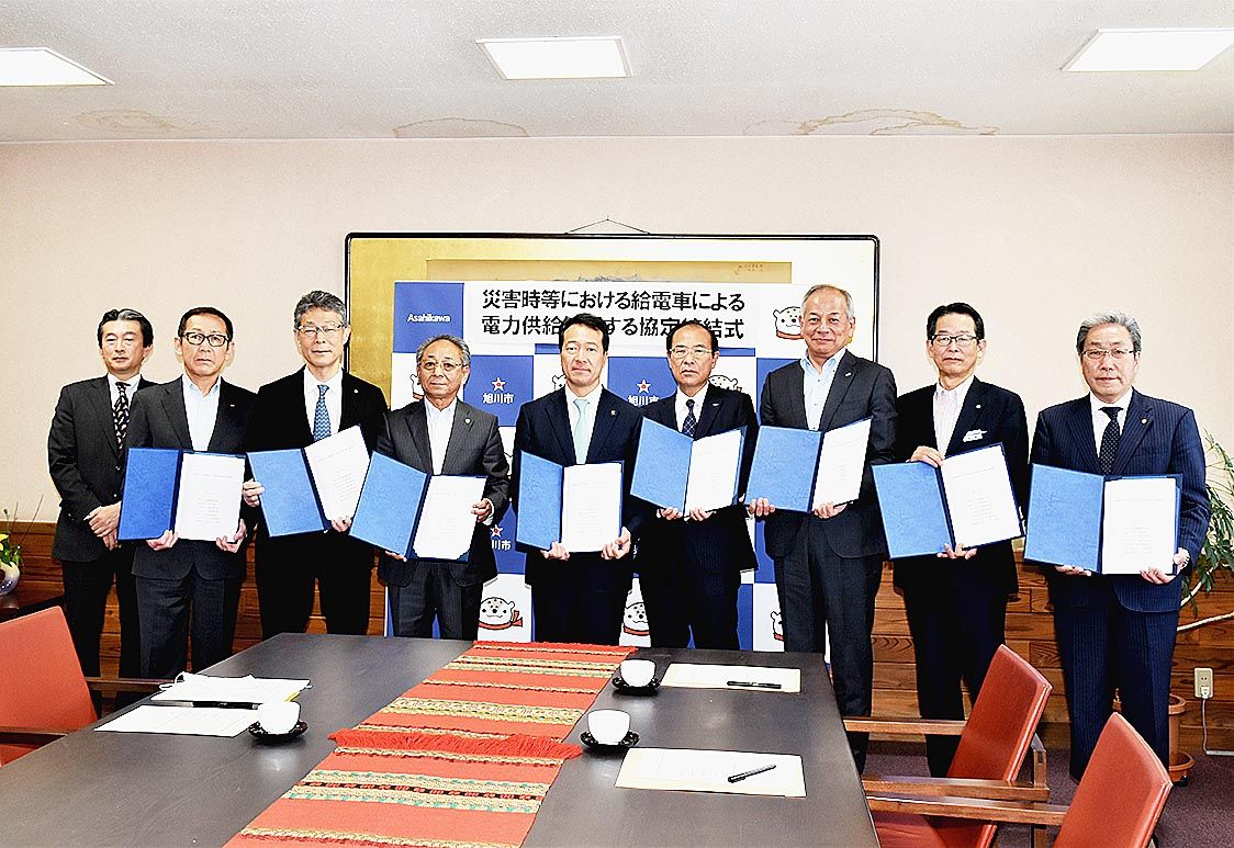 【旭川】旭川地区トヨタ販売店・レンタリース店7社は22日、旭川市と「災害時等における給電車による電力供給に関する協定」を締結した。各社は地震や台風などの災害発生時、給電機能のあるハイブリッド車(HV)、プラグインハイブリッド車(PHV)を...