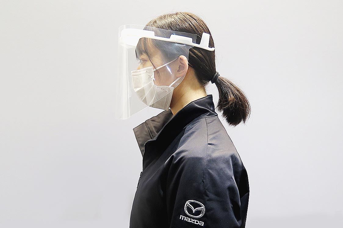 同日にオンライン会見したマツダによると、4月中旬に広島県から要請を受けて開発期間に1カ月かけた。フレームの射出成型に必要な金型も内製で、1週間の短期間で仕上げたという。製造は同社の生産技術開発棟にある実験用の射出成型機を使用し、生産能力は日産900個。射出成型後に製品を切り離し、サンドペーパーによる仕上げや洗浄、アルコールによる拭き上げ、完全なパッキングと配送にも考慮して最前線ですぐに着用できるようにした。シールドフィルムは使い捨てで、使用前にセットする。製造現場での使用を考慮し、夏場でも使用できるように工夫した。