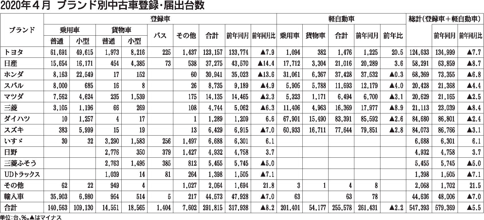 〈2020年4月 ブランド別中古車登録・届出台数〉