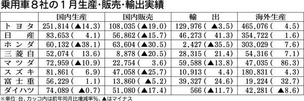 乗用車メーカー8社が発表した1月の生産・輸出、販売実績によると、海外生産台数が前年同月比5・8%増の146万6514台となり、依然として高い伸び率を見せた。 海外生産台数は、三菱自動車、スズキ、ダイハツを除く5社が1月として過去最高。北米...