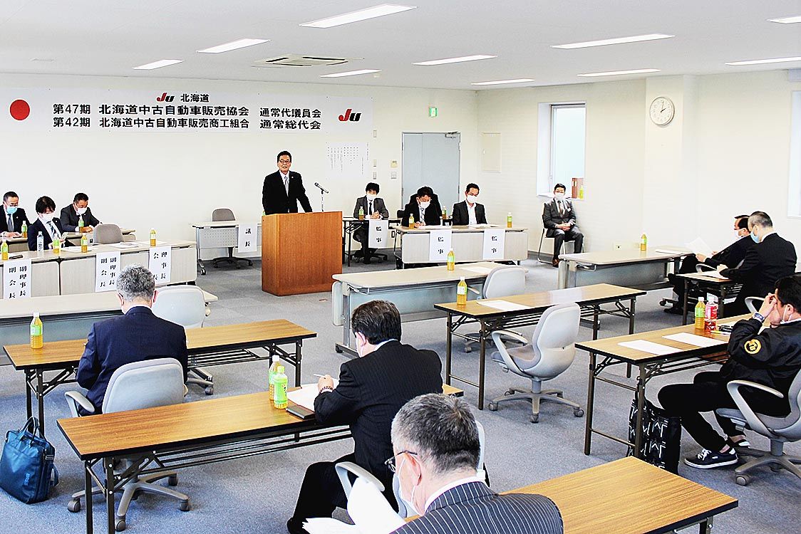 【札幌】北海道中古自動車販売協会・同商工組合(JU北海道、問谷功三会長・理事長)は、通常代議員会・通常総代会をJU札幌会場で開いた=写真。新年度の事業計画にオートオークション(AA)の拡大や検査員認定制度の強化などを盛り込み、事業の活性化...
