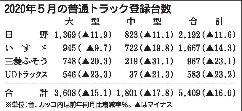 業界筋がまとめた普通トラック(積載4㌧クラス以上)の5月の新車販売台数は、前年同月比16・0%減の5409台となり、8カ月連続で前年実績を下回った。新型コロナウイルスの感染拡大による外出自粛などの影響で2桁減となったが、登録車市場全体のマ...