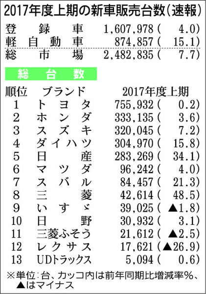 日本自動車販売協会連合会(自販連)と全国軽自動車協会連合会(全軽自協)が2日発表した2017年度上期(4~9月)の新車販売台数は、前年同期比7・7%増の248万2835台で、上期として5年ぶりの増加となった。登録車は、同4・0%増の160...