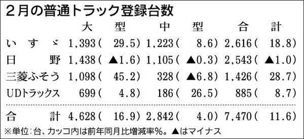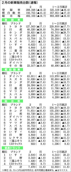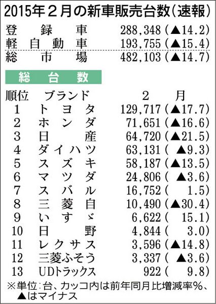 日本自動車販売協会連合会(自販連)と全国軽自動車協会連合会(全軽自協)が2日に発表した2015年2月の新車販売台数は、前年同月比14・7%減の48万2103台だった。2カ月連続の前年割れだが、昨秋以降に投入された新型車効果で減少幅は1月実...