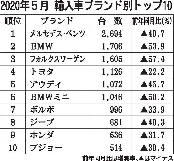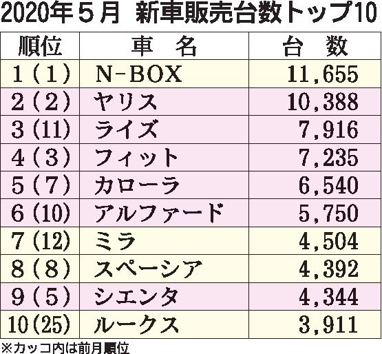 2020年5月の車名別新車販売、登録車が2~6位占める 軽は大幅減目立つ