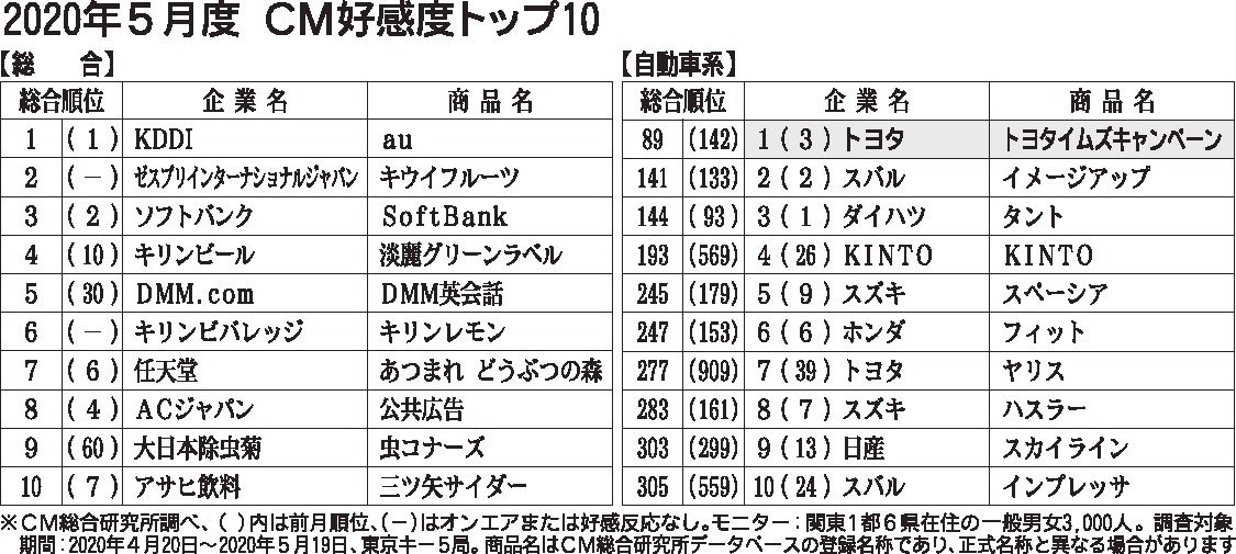 CM総合研究所(関根心太郎代表、東京都港区)は、2020年5月度のCM好感度ランキングを公表した。総合ランキングではauスマートフォンの料金プランを訴求するKDDI「三太郎シリーズ」が5カ月連続の首位、2位は圏外から浮上したゼスプリインターナショナルジャパン「キウイフルーツ」。自動車業類はトップ10を逃した。