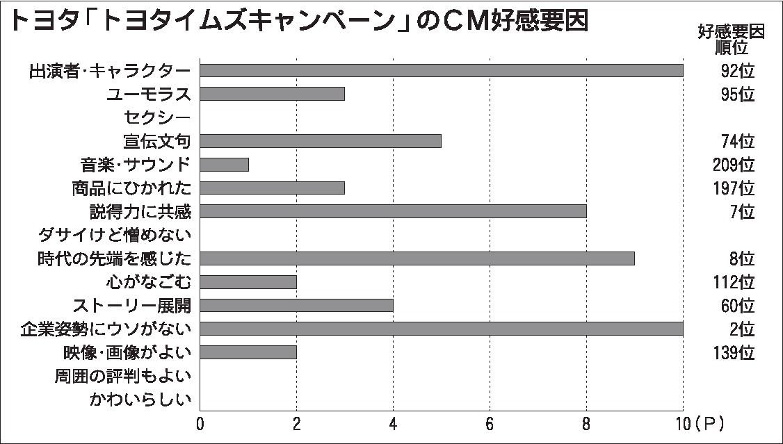 自動車業類の好感度ランキングでは、トヨタ自動車「トヨタイムズキャンペーン」が首位に上昇。CM総研は、このCMに注目した。