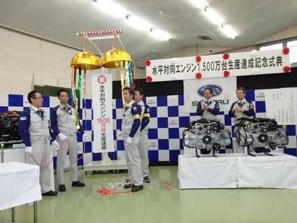 富士重工業は17日、水平対向エンジンの累計生産が1500万台を達成したと発表した。1966年に水冷水平対向4気筒アルミエンジンを開発し、小型乗用車「スバル1000」に搭載してから49年目で大台を達成した。 水平対向エンジンは、対向するピス...