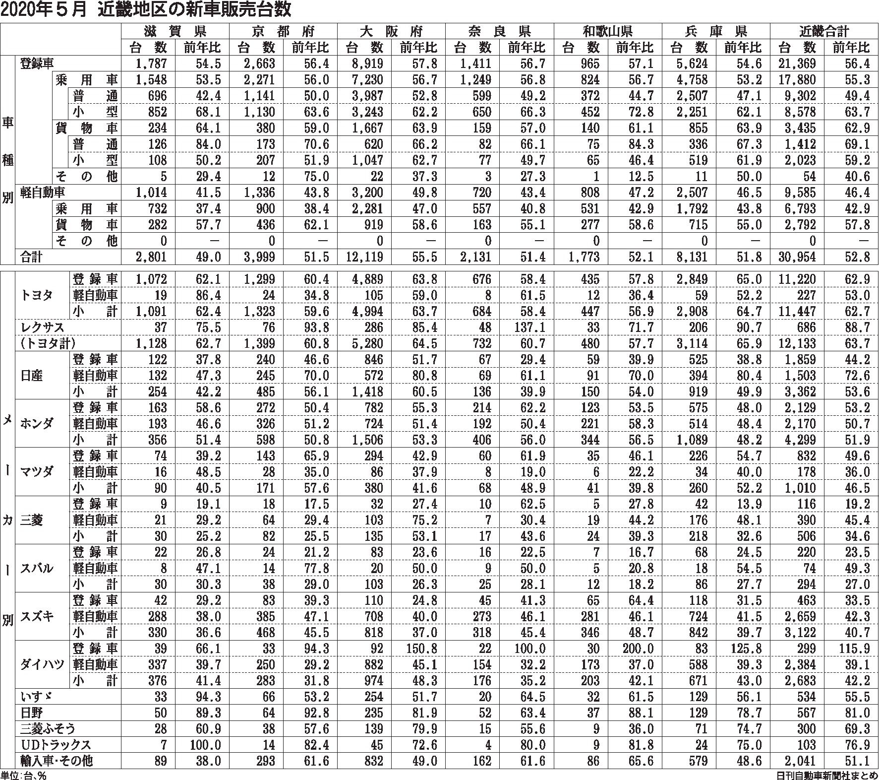 〈2020年5月 近畿地区の新車販売台数〉