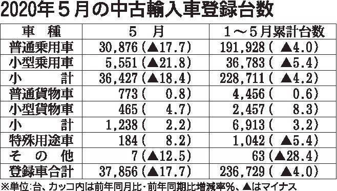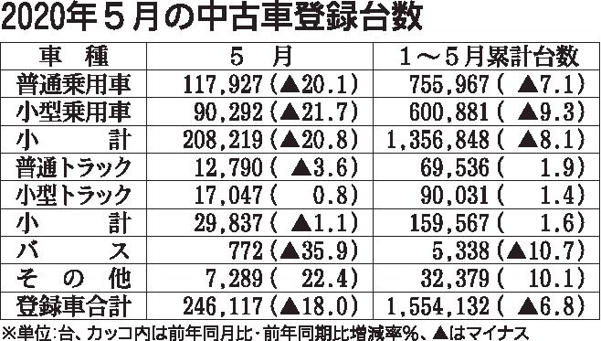 日本自動車販売協会連合会(自販連、加藤和夫会長)が10日に発表した2020年5月の中古車登録台数は、前年同月比18・0%減の24万6117台となり、8カ月連続で前年を下回った。2桁のマイナスとなったのは14年11月以来66カ月ぶり。197...