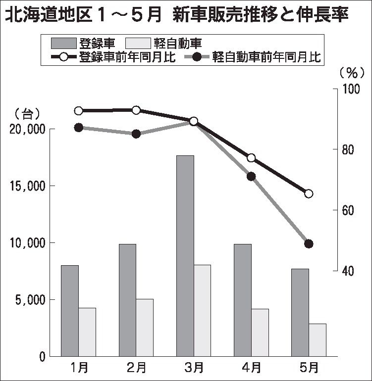 【札幌】5月度の北海道地区新車販売台数(登録車と軽自動車の合計)は、前年同月比40・1%減の1万534台だった。同月として2011年の東日本大震災当時よりも下げ幅が大きい。登録車の34・6%減に対し、軽自動車は51・1%減と半減した。新型...