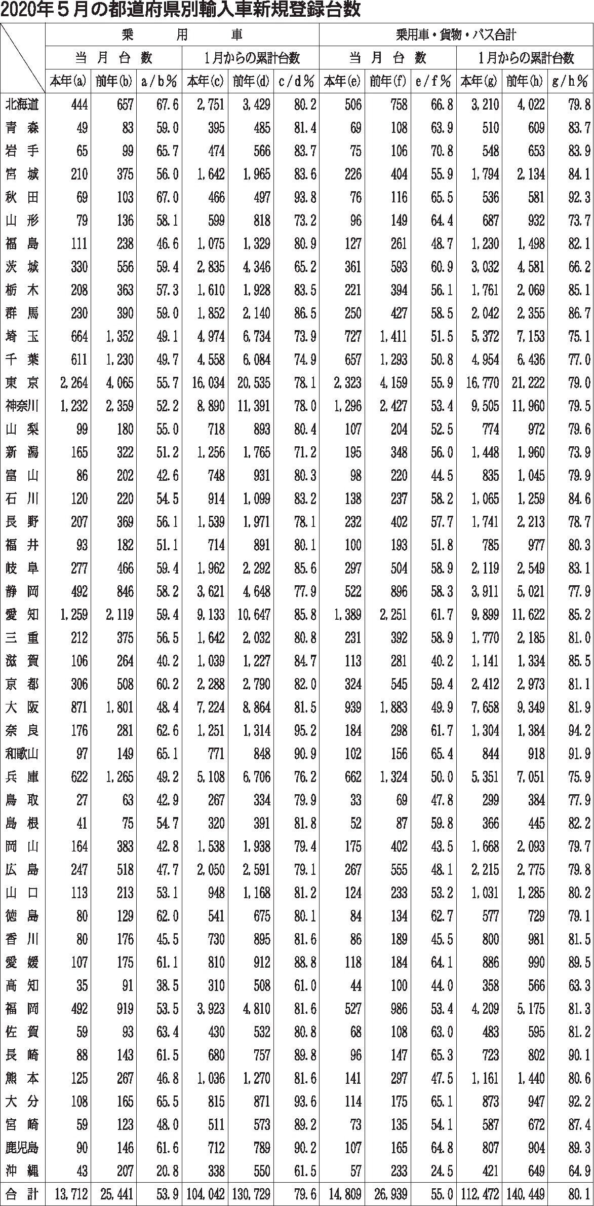 〈2020年5月の都道府県別輸入車新規登録台数〉