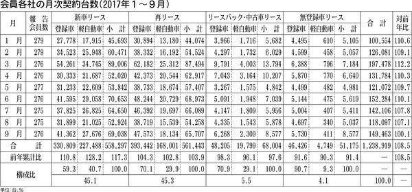 日本自動車リース協会連合会(JALA、東馬圭一会長)は、会員会社の2017年1~9月の契約台数を発表した。新車リースは前年同期比17・3%増の55万8297台だった。同軽自動車が30%近く伸びた。 新車リースのうち、登録車は同10・8%増...