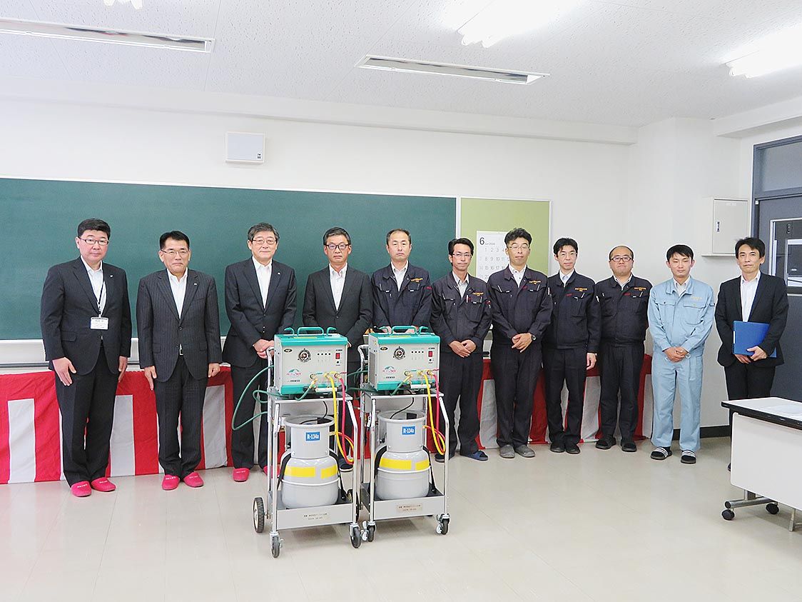 【広島】アンフィニ広島(土田和正社長)は1日、広島工学院大学校(半明英幸校長、広島市安佐南区)に整備士教育に役立ててほしいとフロンガス回収機2台を寄贈した=写真。創業60周年記念事業の一環。土田社長は60周年の節目に「地域の皆様、学校の皆...