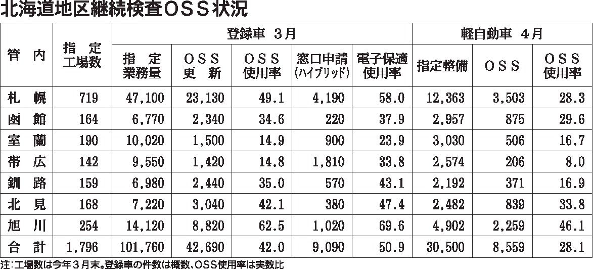 北海道地区の継続検査ワンストップサービス(OSS)状況は、3月度の登録車継続検査で指定工場扱い車検に対するOSS使用率は42・0%になった。前年同月は19・1%に過ぎなかった。また昨年5月から始まった軽自動車では4月度で同28・1%と3割...