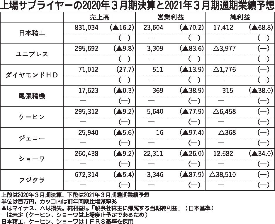 〈上場サプライヤーの2020年3月期決算と2021年3月期通期業績予想〉