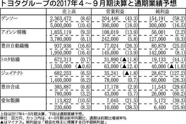 トヨタ自動車系大手部品メーカー7社が31日に発表した2017年4~9月期(第2四半期)連結業績は、円安による為替換算影響に加え、受注増や合理化の効果によって売上高、当期利益が全社増収増益となった。デンソーとアイシン精機は、売上高と営業利益...