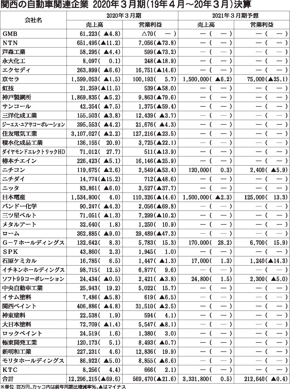 関西に本社を置く自動車関連上場企業の2020年3月期決算が出そろった。日刊自動車新聞社関西支社がまとめた38社のうち半数以上が減収減益となった。世界的な新型コロナウイルス感染拡大の影響から21年3月期業績見通しを発表したのは6社にとどまる...